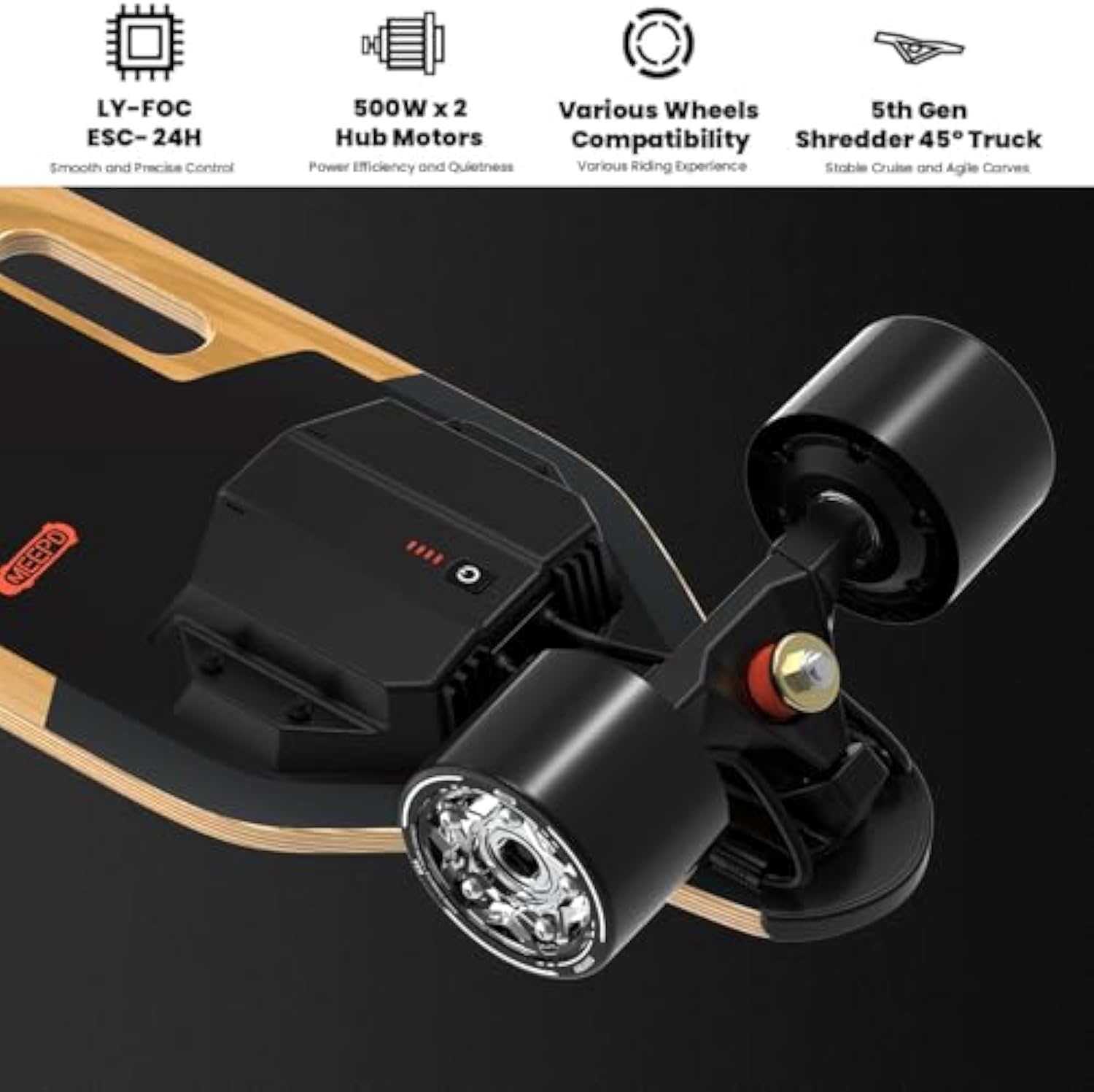 - [Handle Deck] The smartly created MEEPO V5 electric longboard skateboard has a grip that makes it easier to carry. The board is more flexible and durable due to its 8 layers of Canadian maple